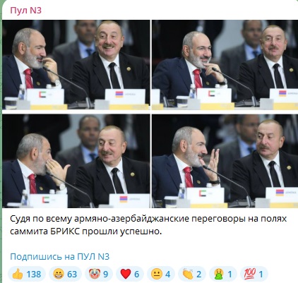 Тем не менее на "БРИКС плюс/аутрич" Алиева с Пашиняном посадили рядом, и это дало свой результат. Путин заметил, как Алиев и Пашинян общались в ходе заседания. И похвалил за обмен мнениями: "Идёт в плюс нашему мероприятию". А премьер Армении в ходе выступления сообщил, что проект договора о мире с Баку согласован как минимум на 80-90%, и предложил Азербайджану подписать договор.