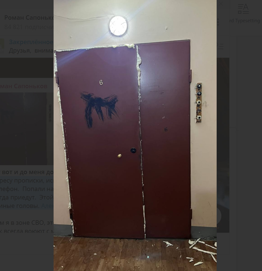 Военкору Роману Сапонькову "запенили" дверь квартиры в Петербурге. Как сообщил он в своём телеграм-канале, исполнители этой провокации затем позвонили с угрозами. Кто это было, стало понятно по первым фразам.