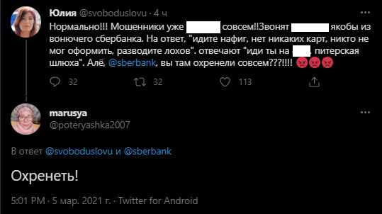 Пользователь Twitter по имени Юлия рассказала, что мошенники уже совсем совесть потеряли. Ей позвонили и представились работниками Сбера. Девушка ответила, что не желает продолжать разговор, потому что ни она, ни члены её семьи держателями карт и, соответственно, клиентами банка не являются. Она посоветовала "разводить лохов". На это звонящий её оскорбил и нецензурно послал.