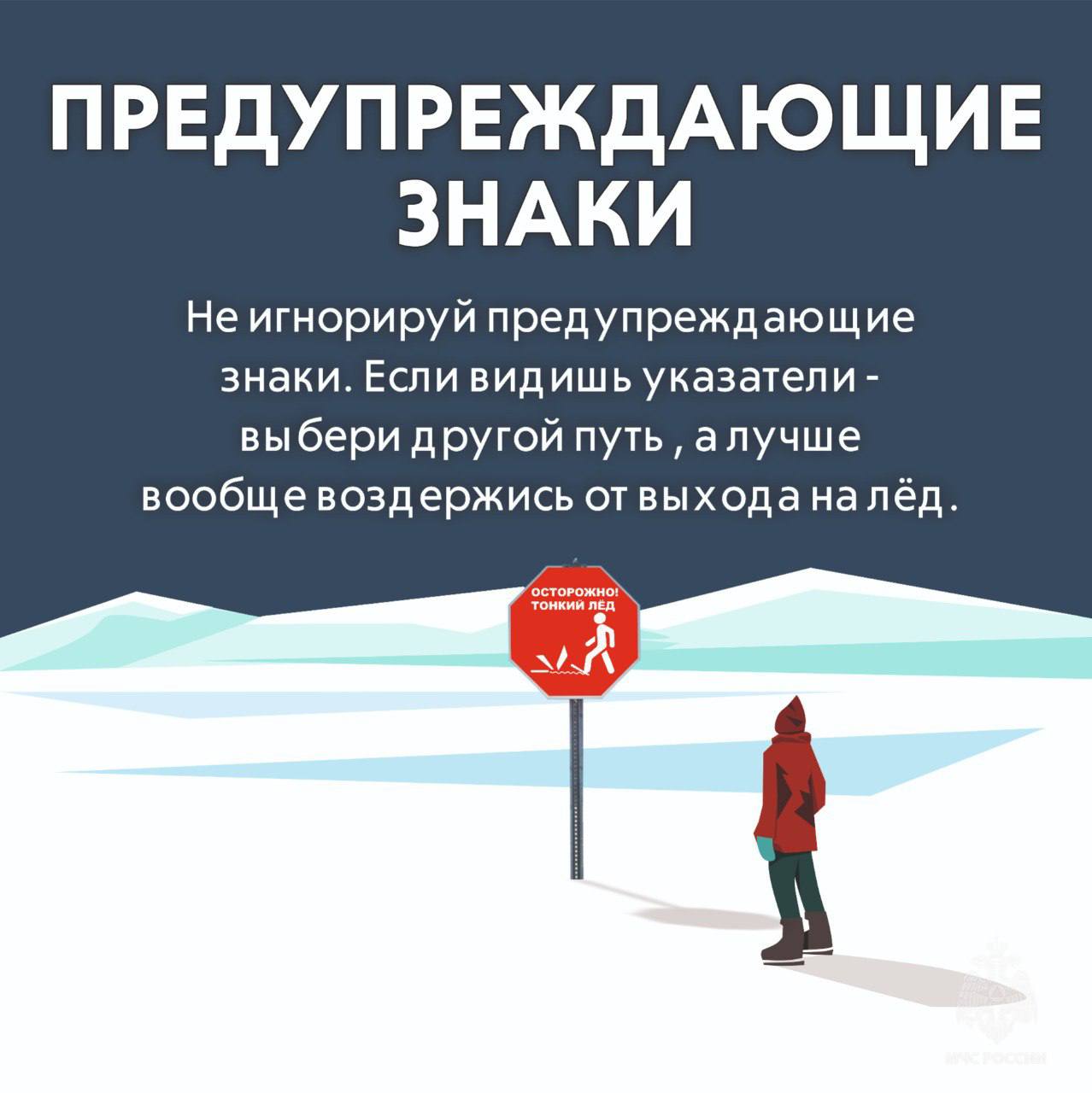 Гражданам сообщают, что наибольшая опасность возникает после потепления или при ожидаемых колебаниях температуры. Кроме того, людям рекомендуют обращать внимание на цвет льда. Так, на его тонкость указывает тёмный оттенок. О многом может сказать и характерный треск. Также людей призывают не игнорировать знаки, предупреждающие об опасности.