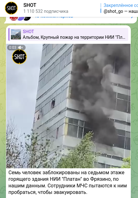 "Семь человек заблокированы на седьмом этаже горящего здания НИИ "Платан" во Фрязино, по нашим данным, - сообщает SHOT. - Сотрудники МЧС пытаются к ним пробраться, чтобы эвакуировать".