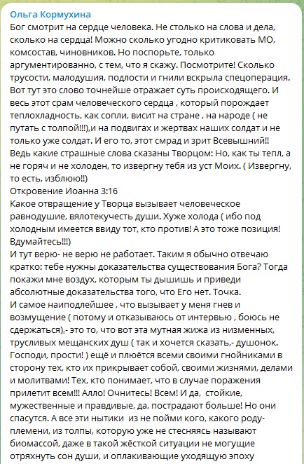 "Бог смотрит на сердце человека. Не столько на слова и дела, сколько на сердца!" - так начинается пост Кормухиной. Она отмечает: можно сколько угодно критиковать наше министерство обороны, командирский состав, чиновников. При этом нельзя отрицать, что спецоперация оказалась лакмусовой бумажкой, которая проявила трусость, малодушие, подлость и гниль в обществе.
