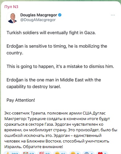 Бывший советник Дональда Трампа, полковник американской армии Дуглас Макгрегор предрёк, что турецкая армия вступится за сектор Газа. По его данным, Эрдоган мобилизует свою страну. Он назвал ошибкой исключение такой версии.