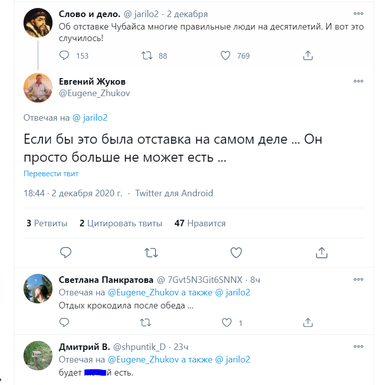 Так, пользователь Twitter Eugene Zhukov сомневается, что с отставкой Чубайса всё так просто:
