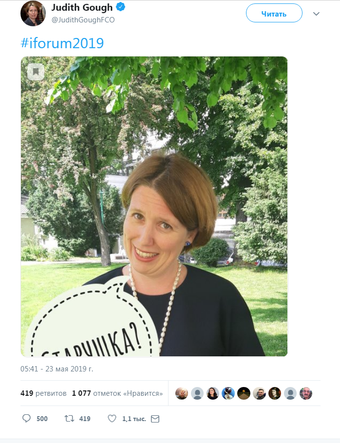 На это отреагировала в своем микроблоге в Twitter посол Великобритании на Украине 46-летняя Джудит Гоф. Она опубликовала собственную фотографию и уточнила: "Старушка?"
