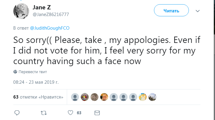 В комментариях под этой публикацией пользователи Twitter извинились за слова Зеленского. "За этот позор придется извиняться нам", - написала Alina Lidus. "Несмотря на то что я голосовал за него, мне жаль, что у нашей страны сейчас такое "лицо", - добавила Jane Z.