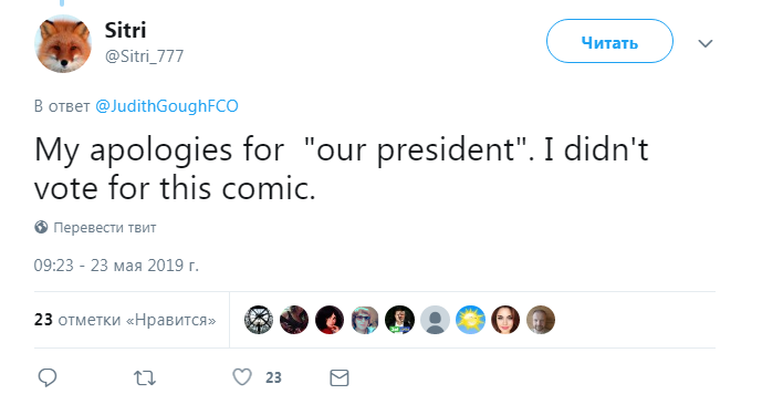 "Приношу извинения за "нашего президента", я не голосовал за этого комика", - написал пользователь под ником Sitri.