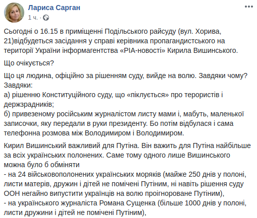 Пресс-секретарь генпрокурора Лариса Сарган в Facebook сообщила о том, что ожидает освобождения Кирилла Вышинского по приговору суда, и подсчитала ценность журналиста, полагая, что его можно было бы обменять на два десятка украинских моряков, а также на Сенцова и Сущенко вместе взятых. "Он значит для Путина больше всех украинских пленных", - считает Сарган.