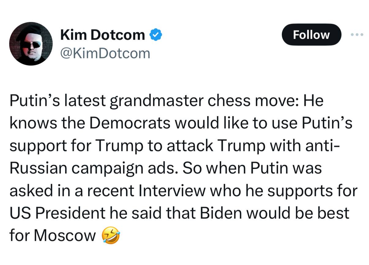 Действующий президент США Джо Байден более предпочтителен для России в качестве главы Белого дома, чем Дональд Трамп, заявил президент России Владимир Путин. Немецкий активист и бизнесмен Ким Дотком назвал слова русского лидера "гроссмейстерским шахматным ходом".
