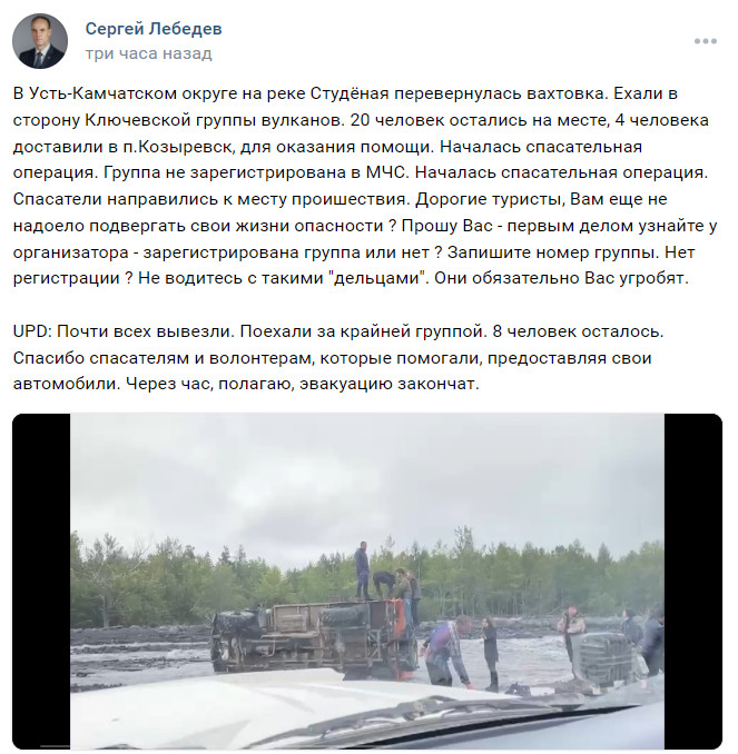 В Усть-Камчатском округе на реке Студёная перевернулась вахтовка. Ехали в сторону Ключевской группы вулканов. 20 человек остались на месте, 4 человека доставили в посёлок Козыревск для оказания помощи. Началась спасательная операция. Спасатели направились к месту происшествия,