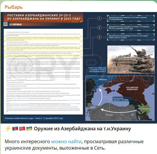 Военный корреспондент, автор ТГ-канала "Рыбарь" Михаил Звинчук, просматривая документы из открытых источников, нашёл информацию, которая на этот раз может окончательно подтвердить факт оружейных поставок от Баку Киеву.