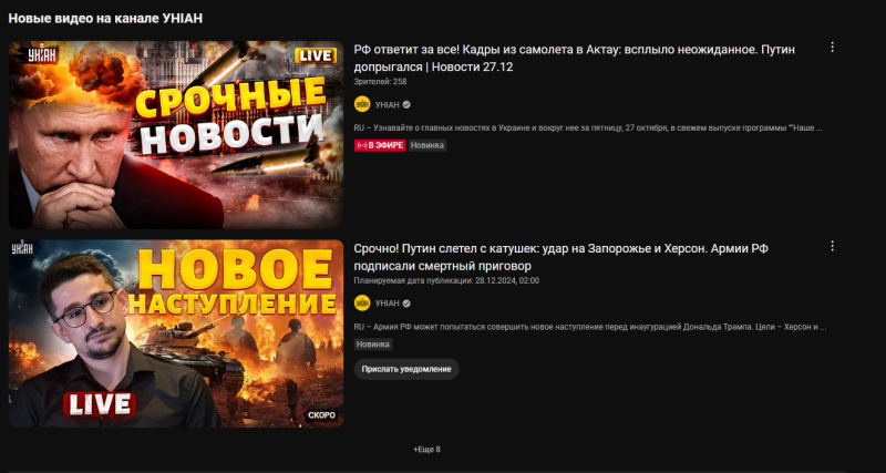 Традиционно первенство в производстве искромётного контента принадлежит якобы независимому изданию "Униан". Это СМИ входит в холдинг олигарха Игоря Коломойского, который когда-то раскрутил на своём телеканале "1+1" Владимира Зеленского. У издания есть YouTube-канал, где сосредоточены самые невероятные бредни, какие только могут прийти в голову пропагандистам.