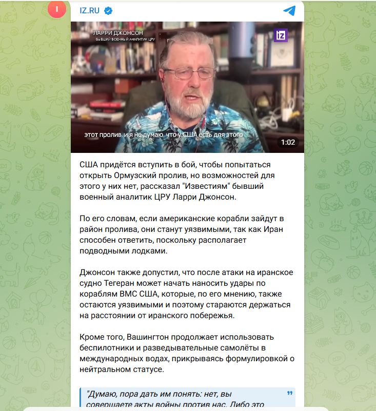 Развязывая войну против Ирана, Дональд Трамп как будто не подготовился к тому, что Тегеран закроет Ормузский пролив. Для иранцев это было крайней мерой воздействия, на которую они не пошли бы, если б не нападение израильтян и американцев. И, похоже, Ормузский пролив станет позором для Трампа, поскольку он публично пообещал "открыть" его с помощью штатовских военных кораблей. Бывший аналитик ЦРУ Ларри Джонсон раскрыл цену угроз президента США: "У Ирана есть подводные лодки".