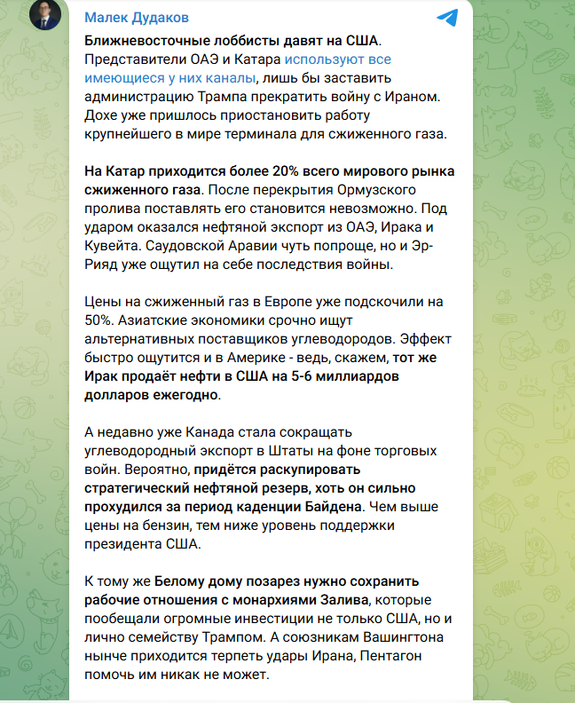 Политолог-американист Малек Дудаков говорит, что ближневосточные союзники США после закрытия пролива начали активно давить на Вашингтон. Эксперт уверен, что особенно яро убеждают Белый дом прекратить войну с Ираном представители ОАЭ и Катара.
