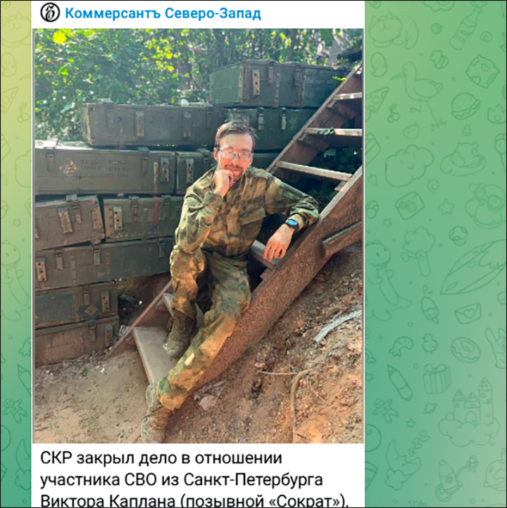 Следственный комитет закрыл уголовное дело против петербуржца Виктора Каплана (позывной "Сократ") - добровольца, обвинённого командирами в самовольном оставлении части. Каплан выжил в трагедии, унёсшей жизни его товарищей по БПЛА - Сергея Грицая ("Эрнест") и Дмитрия Лысаковского ("Гудвин"). Они погибли в бою после конфликта с комполка, а Сократ ушёл из подразделения.