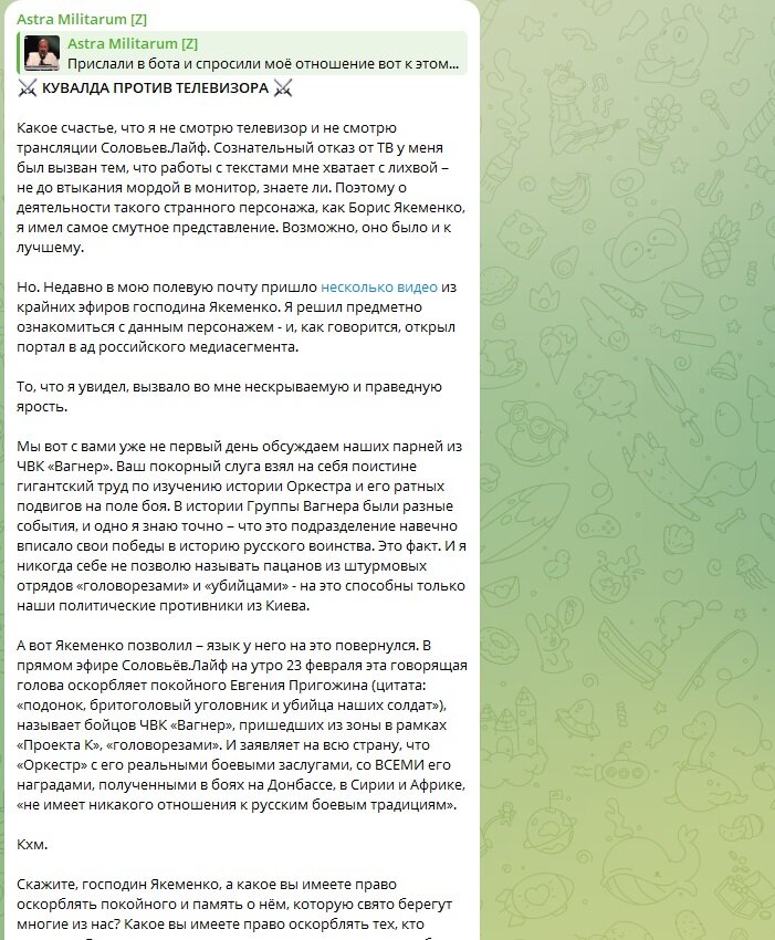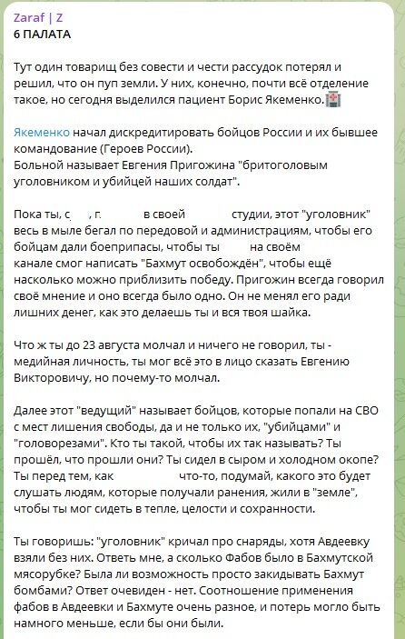 "Пока ты, ***, *** (разговаривал - прим. авт.) в своей *** студии, этот "уголовник" весь в мыле бегал по передовой и администрациям, чтобы его бойцам дали боеприпасы, чтобы ты *** на своём *** канале смог написать "Бахмут освобождён", чтобы ещё насколько можно приблизить победу. Пригожин всегда говорил своё мнение, и оно всегда было одно. Он не менял его ради лишних денег, как это делаешь ты и вся твоя шайка", - пишут в телеграм-канале "Zaraf | Z".