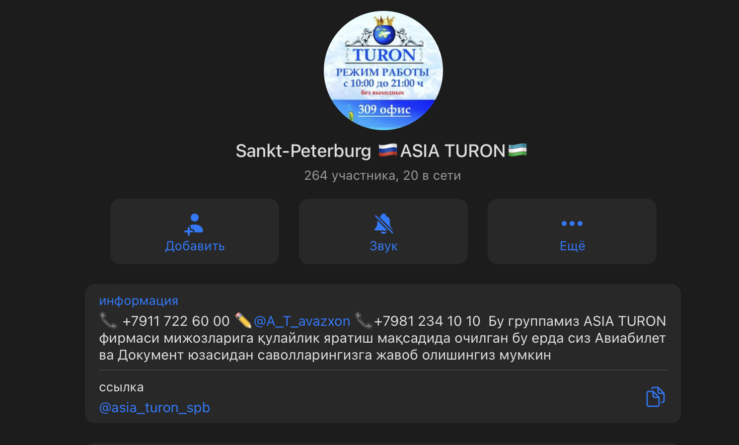 И всё бы ничего, но там активно продвигают услуги по получению патента, регистрацию через УФМС МВД и прочие "плюшки" для гостей из стран ближнего зарубежья. И, что ещё интересно, адрес "Азии Турон СПб", указанный в профиле чата, располагается всего в 240 метрах от 78-го муниципального округа.
