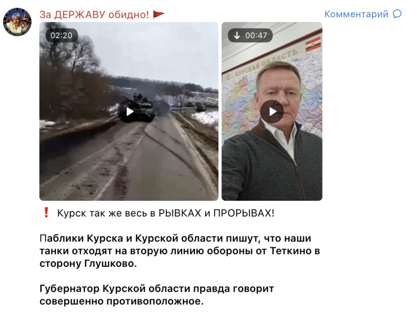 Курские паблики пишут, что наши [российские] танки отходят на вторую линию обороны от Тёткино в сторону Глушково,