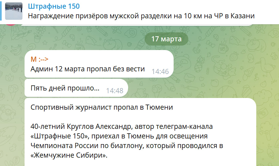 40-летний Круглов Александр, автор телеграм-канала "Штрафные 150", приехал в Тюмень для освещения Чемпионата России по биатлону, который проводился в "Жемчужине Сибири". Мужчина пропал 12 марта,