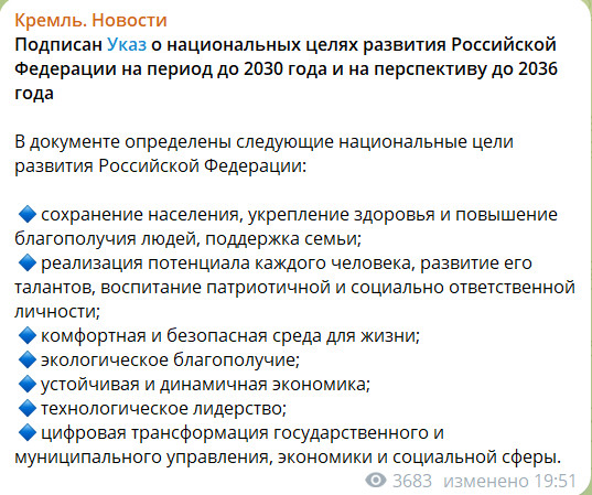 Президент Владимир Путин подписал Указ о национальных целях развития Российской Федерации на период до 2030 года и на перспективу до 2036 года. Всего в перечне - семь целей. От сохранения населения до цифровой трансформации.