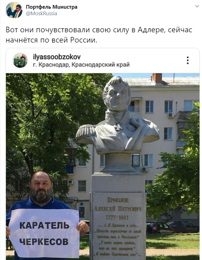 Сочинские активисты переключились с солдат на генералов. В Адлере начали требовать сноса памятника командующего русскими войсками времён Кавказской войны Алексею Ермолову.