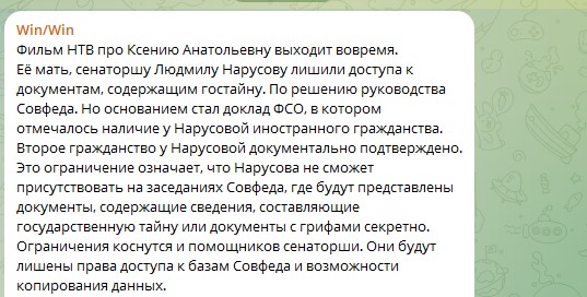 К слову, одновременно с выходом программы также в соцсетях появилась информация и о матери Собчак - сенаторе Людмиле Нарусовой. По данным телеграм-канала Win/Win, сенатора лишили доступа к документам, содержащим гостайну.