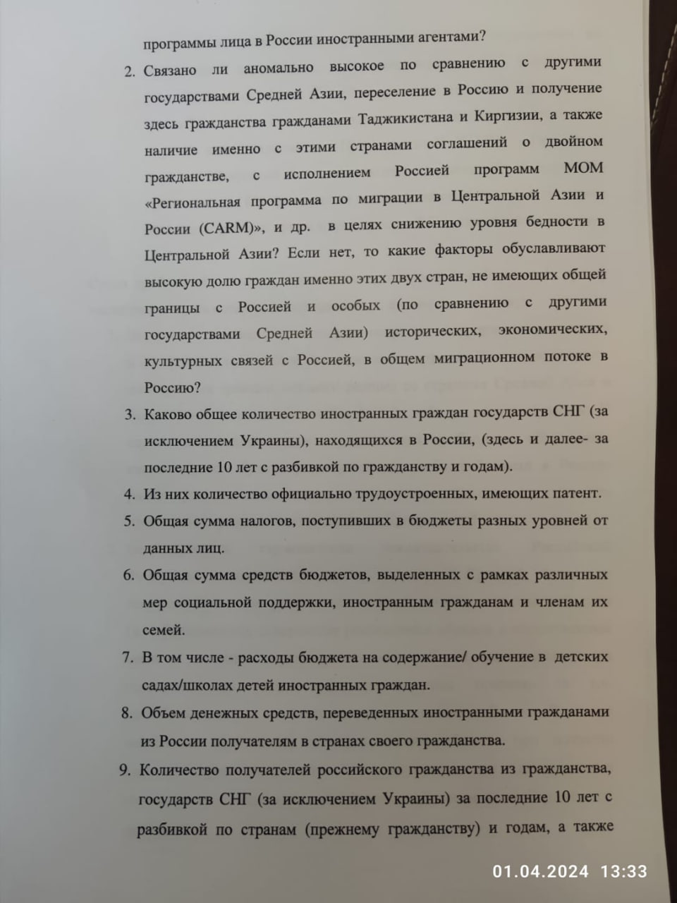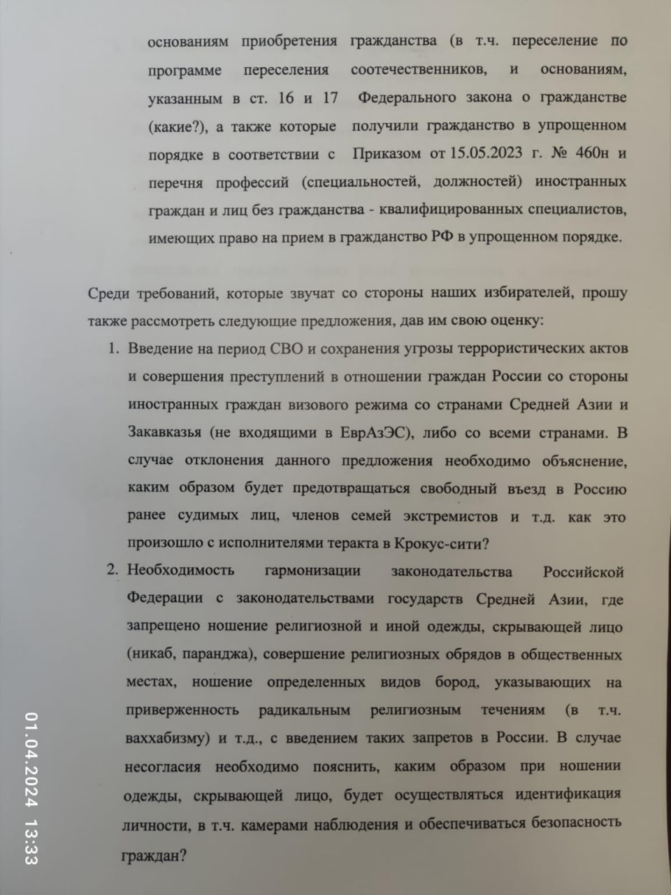 - Введение на период СВО и сохранения угрозы террористических актов и совершения преступлений со стороны иностранных граждан визового режима со странами Средней Азии и Закавказья (не входящими в ЕврАзЭС) либо со всеми странами. В случае отклонения данного предложения необходимо объяснение, каким образом будет предотвращаться свободный въезд в Россию ранее судимых лиц, членов семей экстремистов и т.д., как это произошло с исполнителями теракта в "Крокус Сити"?