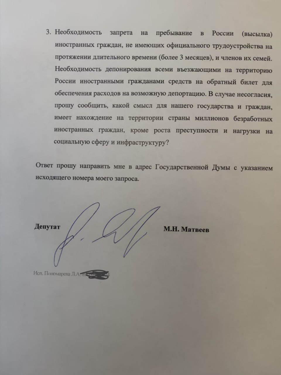 - Необходимость запрета на пребывание в России (высылка) иностранных граждан, не имеющих официального трудоустройства на протяжении длительного времени (более 3 месяцев), и членов их семей. Необходимость депонирования всеми въезжающими на территорию России иностранными гражданами средств на обратный билет для обеспечения расходов на возможную депортацию. В случае несогласия прошу сообщить, какой смысл для нашего государства и граждан имеет нахождение на территории страны миллионов безработных иностранных граждан, кроме роста преступности и нагрузки на социальную сферу и инфраструктуру?
