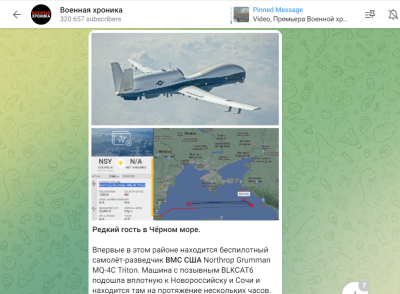 АМЕРИКАНСКИЕ БПЛА ПО НЕСКОЛЬКО СУТОК ВИСЯТ У ГРАНИЦ КРЫМА, НА СОТНИ КИЛОМЕТРОВ СКАНИРУЯ НАШУ ТЕРРИТОРИЮ. ИСТОЧНИК: ТГ-КАНАЛ "ВОЕННАЯ ХРОНИКА"