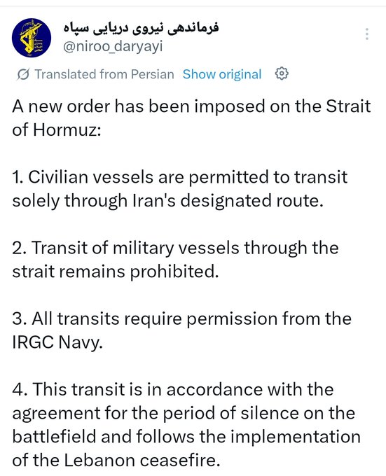 Глава МИД Ирана Аббас Аракчи в связи с перемирием в Ливане заявил, что проход всех коммерческих судов через Ормузский пролив полностью открыт на время прекращения огня. Речь идёт о сроке в 10 дней.