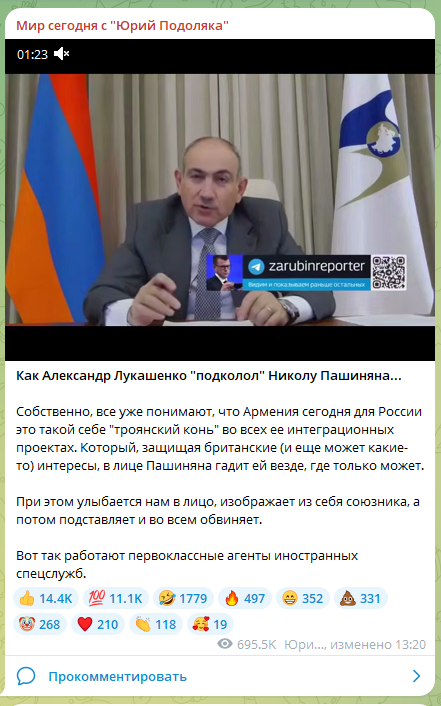 Собственно, все уже понимают, что Армения сегодня для России - это такой себе "троянский конь" во всех её интеграционных проектах. Который, защищая британские (и ещё, может, какие-то) интересы, в лице Пашиняна гадит ей везде, где только может,