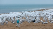 Море выносит тягучую массу на берег, где её собирают вручную и вывозят на полигоны для утилизации. Волонтёры отмывают птиц, которые пострадали в результате экологической катастрофы.