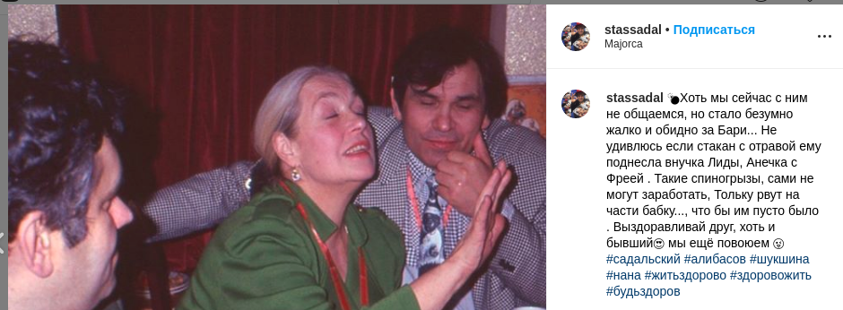 Актер Станислав Садальский у себя в Instagram раскрыл семейную тайну Бари Алибасова и предположил, что музыкального продюсера отравили специально - он не случайно выпил по ошибке жидкость для очистки труб. "Такие спиногрызы, сами не могут заработать, - пишет Садальский. - Только рвут на части бабку".