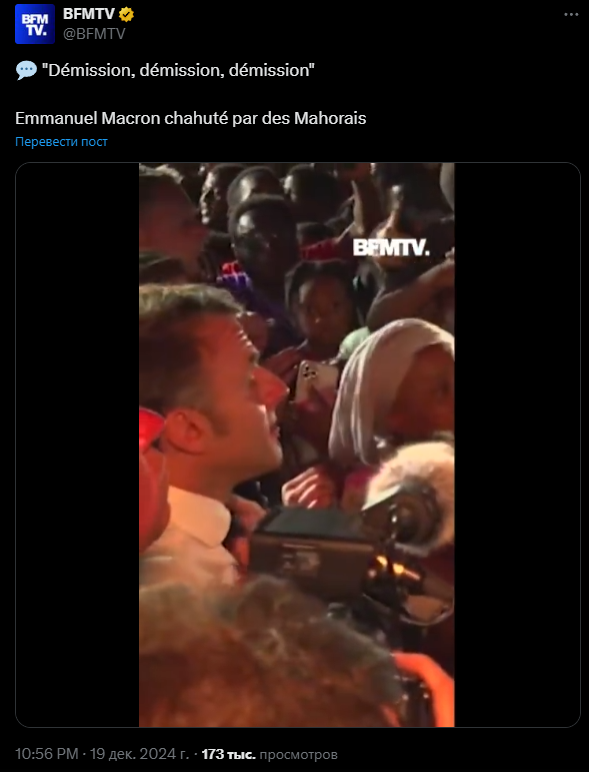 На остров прибыл Эммануэль Макрон, однако его встретила волна народного гнева. Видео с тем, как политика бурно освистали, опубликовала телекомпания BFM.