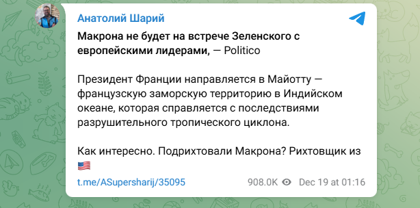 И вот теперь, говорят источники, Макрон попросту сбежал от встречи с Зеленским, а Майотта стала удобным предлогом.