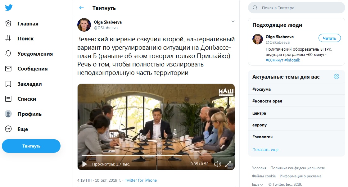 "Зеленский впервые озвучил второй, альтернативный вариант по урегулированию ситуации в Донбассе - "план Б" (раньше об этом говорил только Пристайко). Речь о том, чтобы полностью изолировать неподконтрольную часть территории", - прокомментировала видео Скабеева.