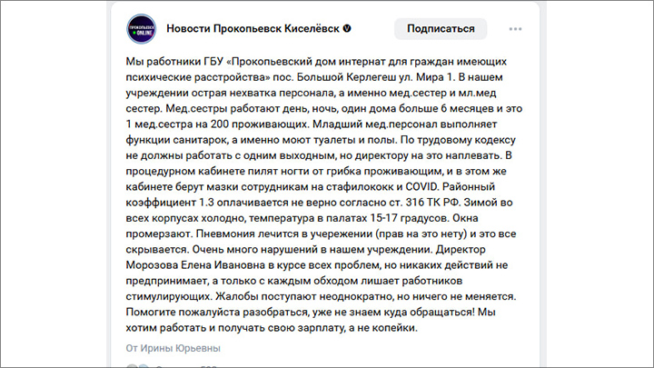 Скриншот поста из ВК, паблик "Новости Прокопьевск Киселёвск". Персонал жалуется на директора Морозову
