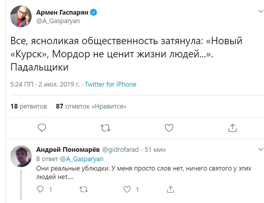 "Все, ясноликая общественность затянула: "Новый "Курск", Мордор не ценит жизни людей..." - отметил публицист Армен Гаспарян. Он метким выражением уязвил глумящихся: "Падальщики".