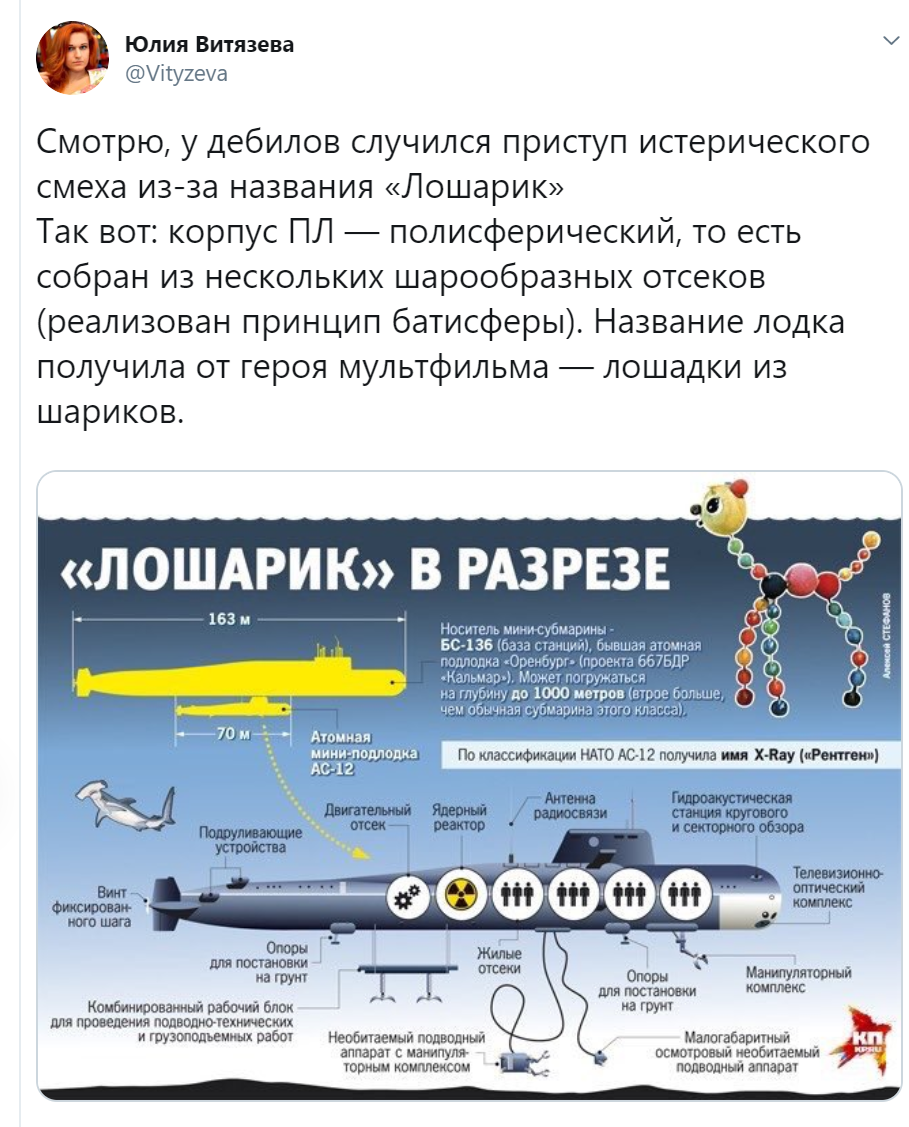 Журналист Юлия Витязева также упрекнула тех, кому стало смешно от неофициального названия подлодки АС-12 ("Лошарик"), на которой, предположительно, произошло ЧП.