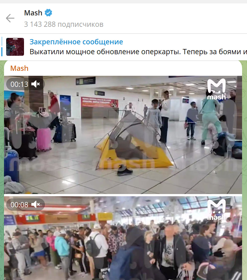 Как сообщает телеграм-канал Mash, 250 русских туристов провели больше суток в зале аэрогавани без еды и воды. Администрация аэропорта ничего не поясняла и не предоставляла номера в гостинице до тех пор, пока в зале ожидания не были установлены палатки.