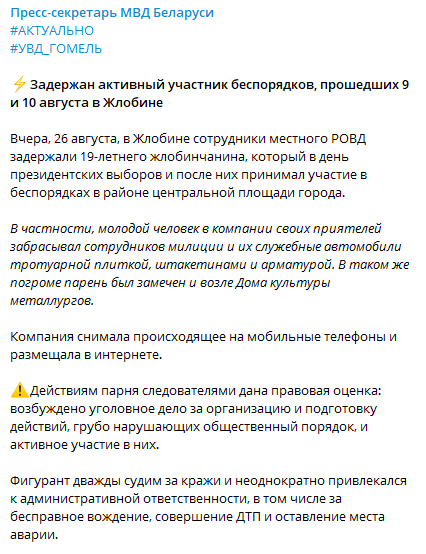 Речь идёт о 19-летнем парне, который участвовал в беспорядках в день президентских выборов и после них. На одном из видео, которое молодой человек выложил в соцсети, он хвастается, что разбил окно автозака булыжником. Впоследствии, уже после задержания, юный революционер дал признательные показания.
