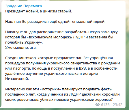 Президент Украины Владимир Зеленский предложил украинизировать молодёжь ДНР и ЛНР. В числе мер, которые бы "всколыхнули молодежь Л/ДНР и заставили бы полюбить Украину", и упрощённая процедура получения украинского гражданства, и помощь при поступлении в вуз, и удалённое изучение украинского языка и истории Незалежной.