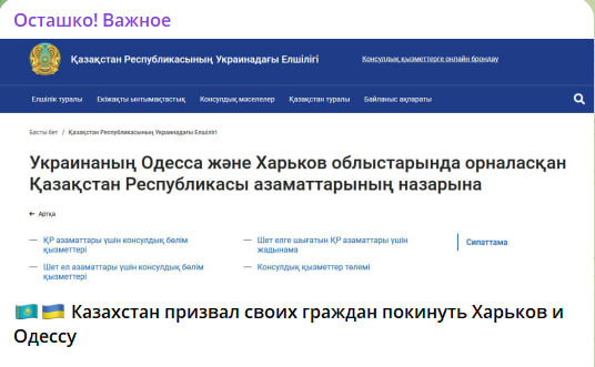 Причём настолько основательно, что "эхо" доносится далеко за пределы фронта. Так, 28 марта посольство Казахстана на Украине официально рекомендовало своим гражданам скорее покинуть территорию Харьковской и Одесской областей.