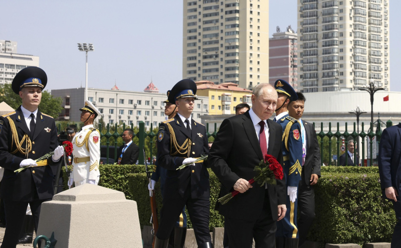 Президент России Владимир Путин возлагает цветы к памятнику советским воинам в Харбине. Фото: Kremlin Pool/Russian Presential/globallookpress