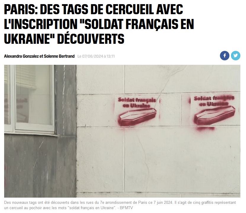 В Париже появились несколько граффити с гробами французских солдат на Украине. Нарисовавшая их группа заявила, что это является "ответом на неадекватные действия французских властей по отношению к активистам, оставившим гробы у Эйфелевой башни".
