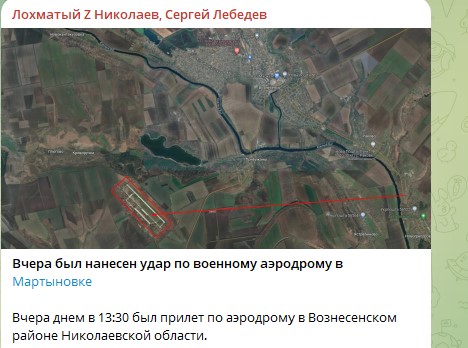 Накануне был нанесён удар по военному аэродрому в Мартыновке, сообщил координатор николаевского подполья Сергей Лебедев со ссылкой на участников подполья. По данным очевидцев, накануне днём в 13:30 был прилёт по аэродрому в Вознесенском районе Николаевской области.