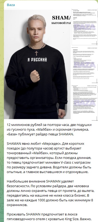 Вопросы у недоброжелателей появились к райдеру певца, который ранее обнародовали в телеграм-канале "База". Согласно ему, за полуторачасовое выступление SHAMAN просит 12 млн рублей. Из требований: "Майбах" с затонированными стёклами за счёт организаторов и скромная гримёрка. Очень серьёзно артист относится к вопросам безопасности. Его должны охранять два человека. А на концерте число присутствующих охранников рассчитывается по формуле 8 человек на тысячу зрителей.