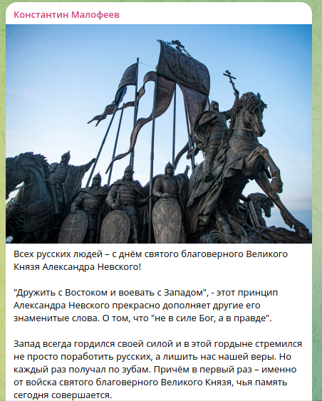 Напомним, Благоверный Князь Александр Невский был причислен Русской Православной Церковью к лику святых в 1547 году. Учредитель Царьграда Константин Малофеев ранее обратил внимание, что в XIII веке Александр Невский не только показал всему миру, что русские способны побеждать Запад. Он навсегда определил геополитический вектор развития нашей цивилизации. И этот выбор был, в первую очередь, духовным: