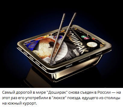Самый дорогой в мире "Доширак" недавно был съеден в "люксе" поезда, едущего из столицы России на южный курорт. Рекорд установил 19-летний сын одного из уральских бизнесменов, записав весь процесс на камеру.