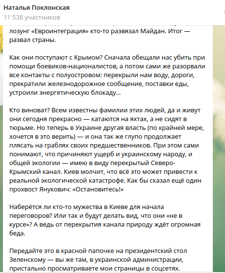 Парламентарий указывает также на то, что власть в Киеве сменилась, однако и новоприбывшие "так же глупо продолжают плясать на граблях своих предшественников". Она уверена, что действующие украинские власти хорошо понимают, что "причиняют ущерб и украинскому народу, и общей экологии - имею в виду перекрытый Северо-Крымский канал".